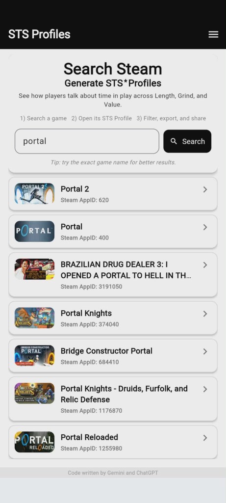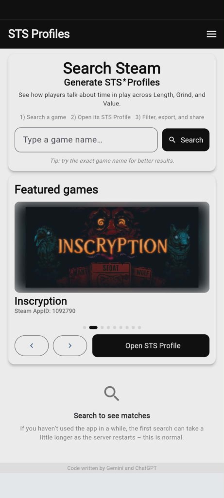 STS Profiles is a small research prototype I built to explore how players talk about time in play. It was inspired by my PhD work on “temporal satisfaction” – the idea that players regularly evaluate whether a game feels worth their time, not just whether it’s “good” or “bad”.