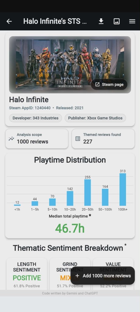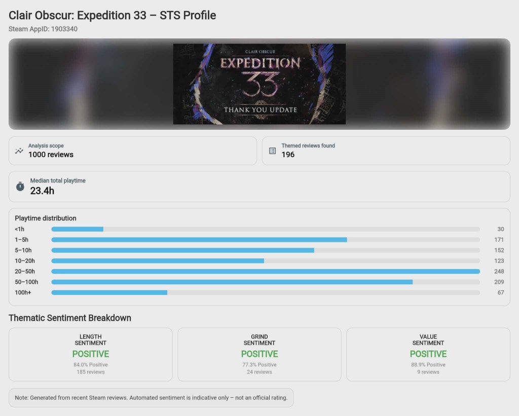 The goal is to offer an accessible, data-informed way to surface patterns in how time is discussed – useful for players (quick context), researchers (a lightweight exploratory tool), and developers (early signals about time-related praise or frustration). This is indicative analysis only, generated automatically from public reviews – not an official rating or endorsement.